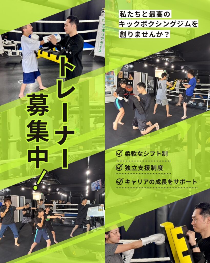 現在、当ジムでは事業拡大に伴い、共に夢を追いかけるトレーナーを募集しています。 私たちが目指しているのは単なる運動施設ではなく、会員様一人ひとりが自信を持ち、人生を豊かにできる場所、そして「最高のキックボクシングジム」です。